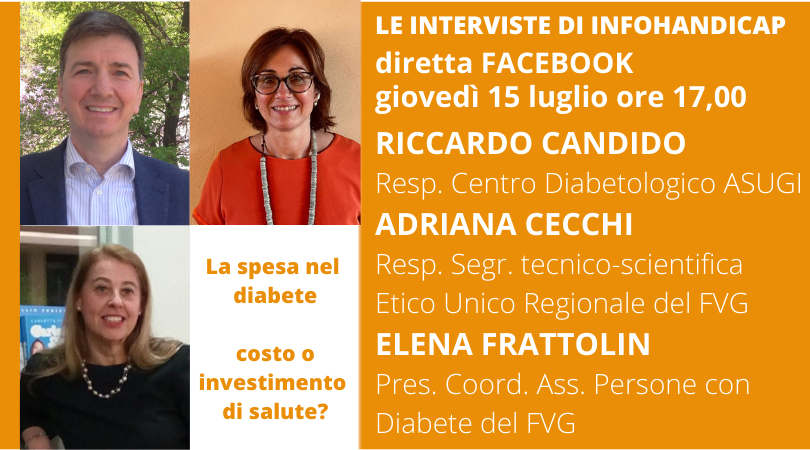 Giovedì 15 luglio 2021 alle ore 17.00, per "Le interviste di InfoHandicap", sulla pagina FB di InfoHandicap, avremo ospiti Riccardo Candido, Resp. Centro Diabetologico ASUGI, Adriana Cecchi, Resp. Segr. Comitato tecnico-scientifica Etico FVG e Elena Frattolin, Pres. Coord. Ass.ni Persone con Diabete FVG.