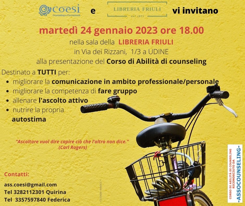 Martedì 24 gennaio 2023 alle ore 18.00, presso la Libreria Friuli - Via dei Rizzani, 1/3 - a Udine, presentazione del corso di abilità di Counseling promosso dall'Associazione di counseling Coesi Aps di Udine in partenza a febbraio 2023.