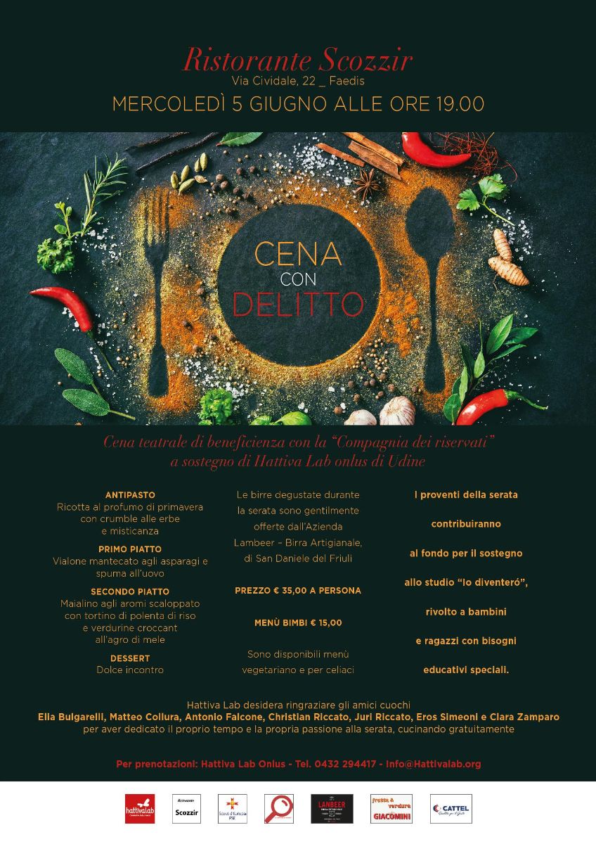 Mercoledì 5 giugno 2019 alle ore 19.00, presso il ristorante Scozzir - Via Cividale, 22 - a Faedis (UD), Cena con delitto organizzata a sostegno di Hattiva Lab Onlus di Udine.