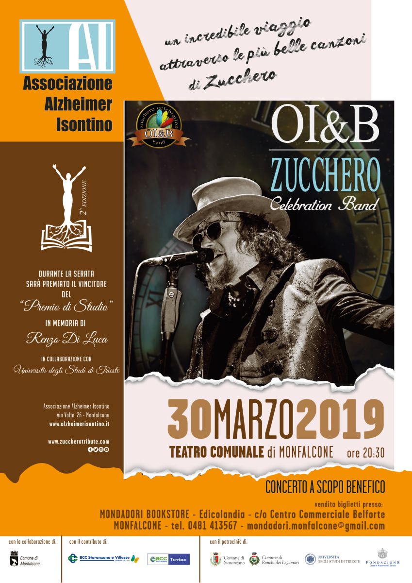 Sabato 30 marzo 2019 alle ore 20.30, presso il Teatro Comunale di Monfalcone (GO), in occasione del diciottesimo anno di attività, l'Associazione Alzheimer Isontino organizza un concerto a scopo benefico del gruppo musicale "O.I.&B. Zucchero Celebration Band".