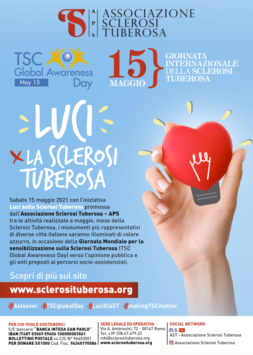 Sabato 15 maggio 2021, Giornata Mondiale per la sensibilizzazione sulla Sclerosi Tuberosa - TSC GLOBAL AWARENESS DAY - malattia genetica rara, che provoca tumori benigni multipli in diversi organi, tra cui sistema nervoso centrale, cuore, reni, polmoni, occhi, cute.