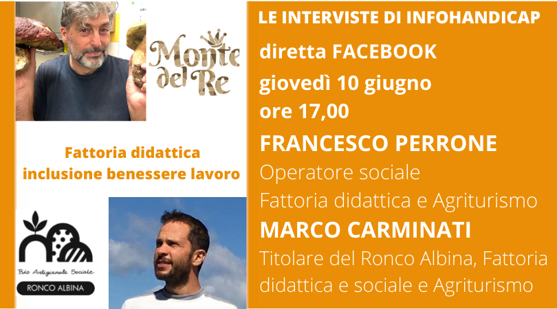 Giovedì 10 giugno 2021 alle ore 17.00, per "Le interviste di InfoHandicap", sulla pagina FB di InfoHandicap, avremo ospiti Francesco Perrone, allevatore e operatore sociale e Marco Carminati, fattoria didattica e sociale.