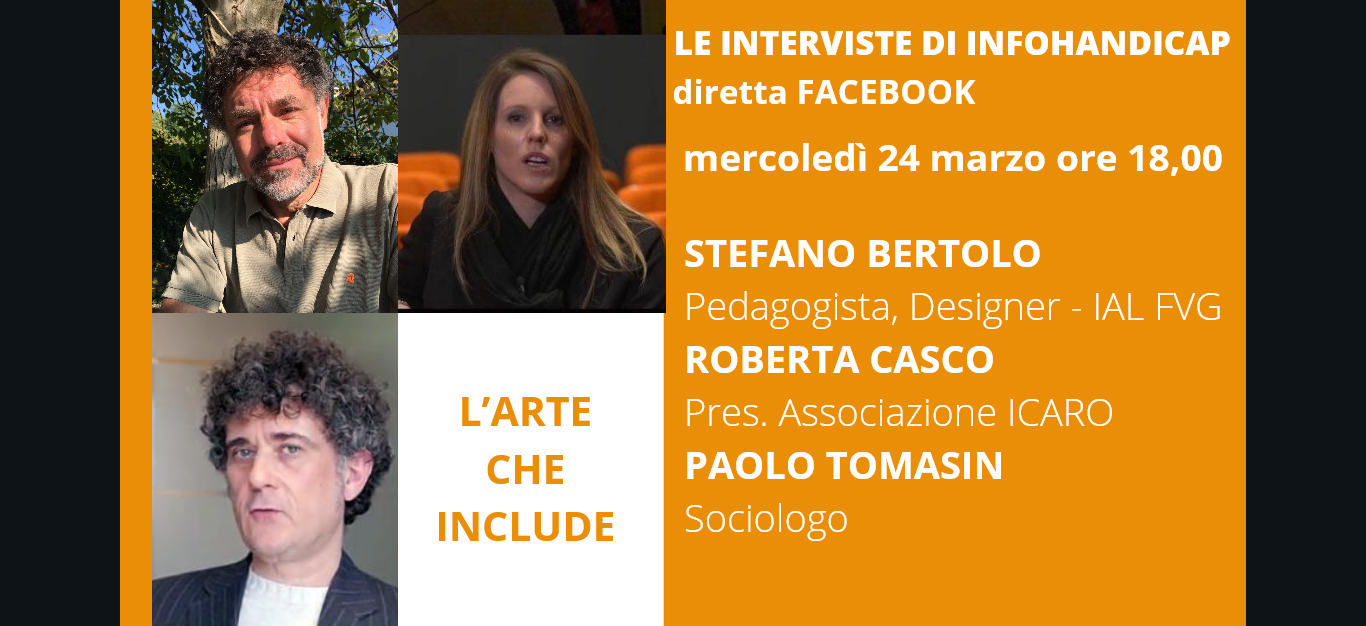 Mercoledì 24 marzo 2021 alle ore 18.00, per "Le interviste di InfoHandicap", sulla pagina FB di InfoHandicap, avremo ospiti Stefano Bertolo, Pedagogista e Designer, Roberta Casco, Pres. Ass.ne Icaro e Paolo Tomasin, Sociologo.