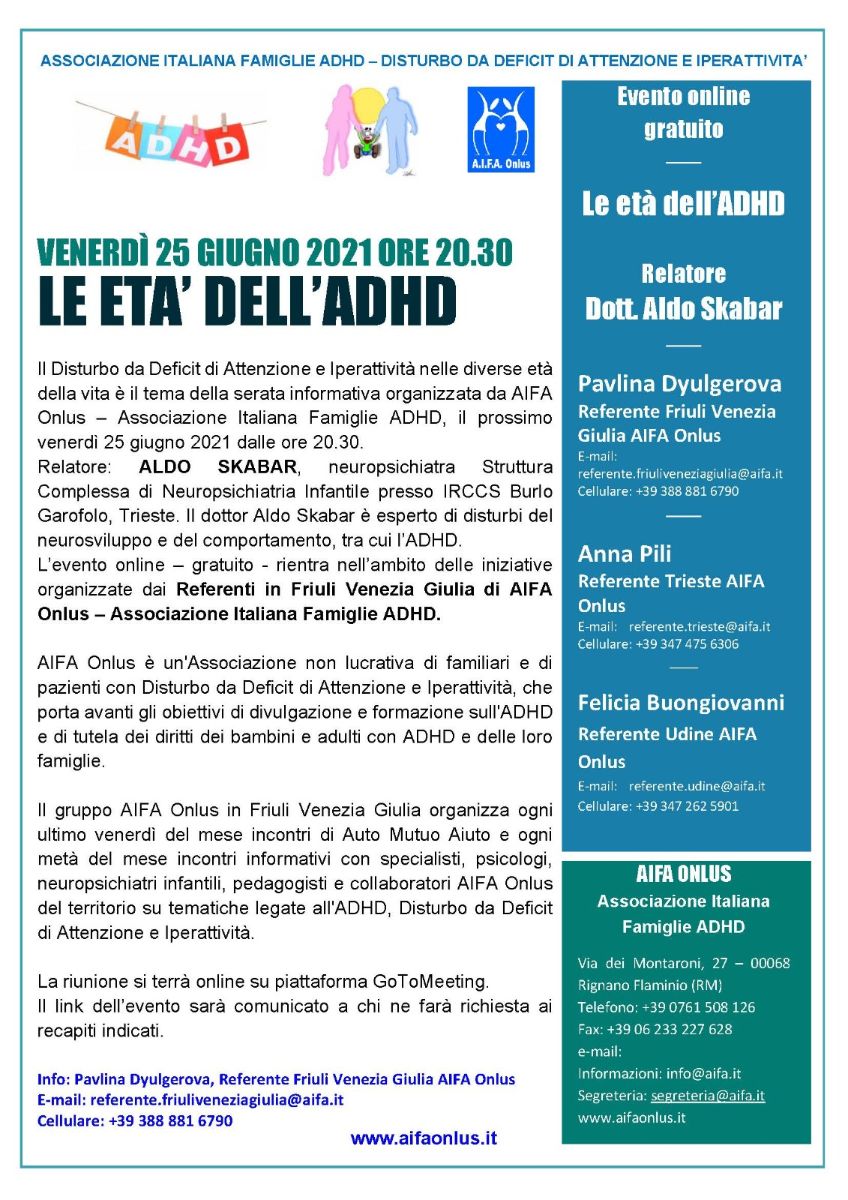 Venerdì 25 giugno 2021 alle ore 20.30, online, l’Ass. It. Famiglie ADHD - Disturbo da deficit di attenzione e iperattività, promuove un appuntamento dal titolo