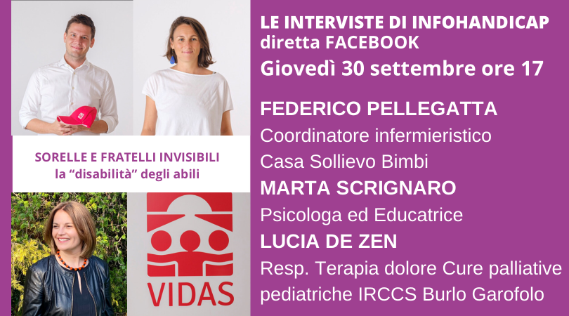 Giovedì 30 settembre 2021 alle ore 17.00, per "Le interviste di InfoHandicap", sulla pagina FB di InfoHandicap, avremo ospiti Federico Pellegatta, Coordinatore infermieristico Casa Sollievo Bimbi, Marta Scrignaro, Psicologa ed Educatrice, Lucia De Zen, Responsabile Centro Regionale Terapia del dolore e Cure palliative pediatriche presso IRCCS Burlo Garofolo di Trieste.